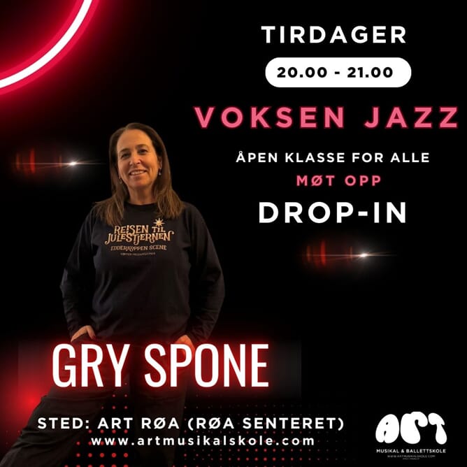 DROP - IN TIMER MED VOKSEN JAZZ Meld deg på kurs eller Drop-in Mandager kl.19-20 på Holmen senteret med Julia Bjanes Tirsdager kl.20-21 på Røa med Gry Spone Tirsdager kl.20.15-21.15 med Louise Tveito Kurs eller Drop-in timer (250,-) Bare møt opp fra uke 4